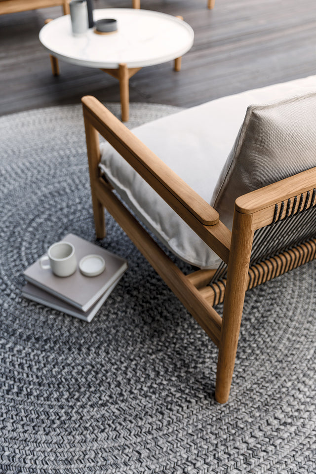 Neuheit 2022: Ein “Design, das eher verführt als schreit” schwebte dem Londoner Designer Mark Gabbertas bei der Kreation seiner Kollektion SARANAC vor. SARANAC kombiniert außerordentlichen Komfort mit zeitloser Ästhetik und herausragender Robustheit gegenüber sämtlichen Witterungseinflüssen. Im soliden Teakholzrahmen mit sanft ausgestellten, sich verjüngenden Beinen, aus allen Blickwinkeln dem Auge schmeichelnd, klingen Mid-Century-Designs an. Eingespannt im Rahmen sind gewebte Outdoor-Seilrücken in kräftiger “Raven”-Farbe. Rücken und Armlehnen sind mit angenehm griffigen Teakholzkappen veredelt.